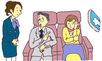 機内での会話を聞いて,【 】からそれぞれ正しいものを選ぼう。