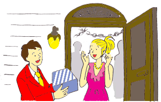 NaoyaはKellyの家のパーティーに招待されました。ふたりの会話を聞いて,【 】からそれぞれ正しいものを選ぼう。