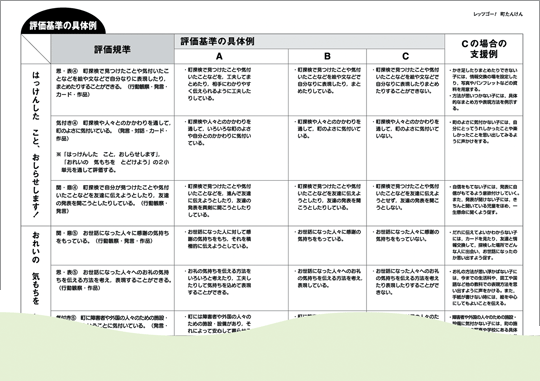 | 各単元の評価規準と基準をまとめたものです。学校の実態にあわせて加工できるように「わくわく・いきいきデータ集」にMicrosoft Excel形式で収録しています。 |