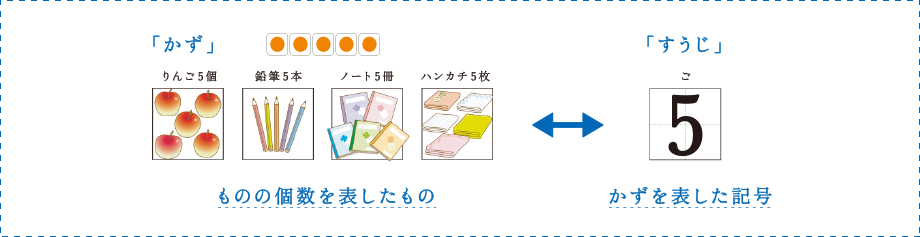 例えば,「コップを5個並べてね」と話したときと,「ノートに5を書いてみよう」といったときの「5」は,同じように見えても違います。