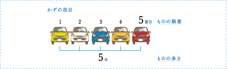 「駐車場に車が5台」の5台は,とまっている車の多さ(台数)を表し,「左から数えて5番目」の5番目は,