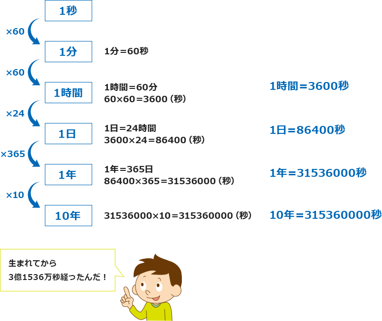 10年が何秒になるかを,次の方法で計算しましょう。
