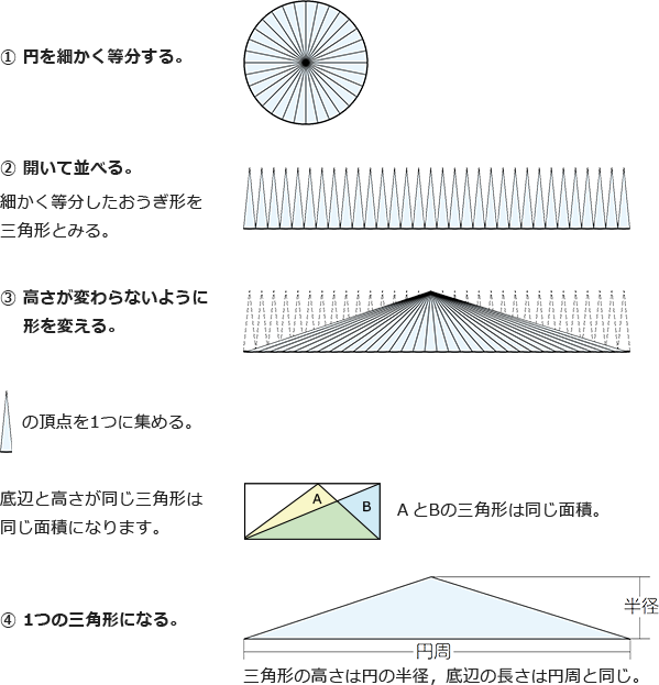 三角形の面積=底辺×高さ÷2 より,円の面積は次の式で求められます。