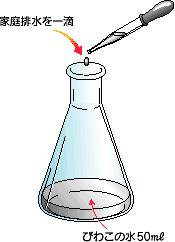 | 琵琶湖の水(透明な池の水でもよい)を三角フラスコに50ml入れる。 |