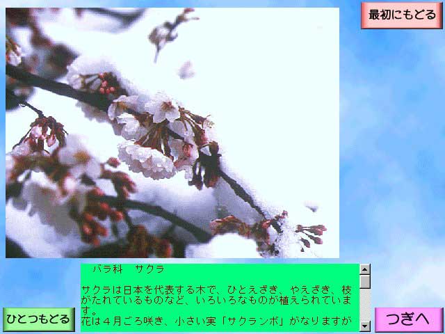 このCDには、児童が学校や家庭の周りの身近な植物を観察し、図鑑などで調べ、学校のコンピュータルームで入力した文字データと児童たちのメッセージ、デジタルカメラなどで撮影した画像データや関係機関から借用した画像データと平成10年11月20日の校内音楽会のビデオから編集した音声データが収録されています。