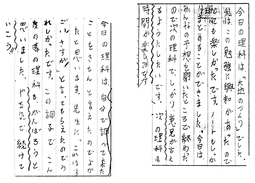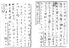 | (1) | 次の理科の授業を楽しみに待つためには,少なくとも,次の時間の内容や課題がしっかりわかっておく必要がある。さらに,その内容や課題は児童にとって「やってみたい。調べてみたい。」と思える内容であることが大切だ。すなわち,学習課題が明確で,児童の発想から出た課題であることが望ましい。 |