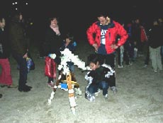 3.天文台からの出前 天文台から来ていただいたのは,大阪教育大学天王寺天文台スカイクルーの人たちと枚方市野外活動センターステラホールカウンセラーの人たちである。大阪教育大学天王寺天文台スカイクルーの人たちには,体育館で人間星座をしていただいた。また枚方市野外活動センターステラホールカウンセラーの人たちには,天体望遠鏡を持ってきていただき月・惑星・恒星を見せていただいた。 この星空観望会の前には,天体望遠鏡による昼間の白い月を観察させたり,毎日変化する太陽黒点の観察も経験させた。また総合的な学習で,「太陽から地球環境を学ぶ」をテーマに行ってきたため,天体についてはいろいろと体験をさせてきた。かわべ天文公園とインターネットで結び,太陽表面が時々刻々と変化する様子をリアルタイムで送ってきていただいた。「近傍の惑星」について学習したときは,大阪教育大学天王寺天文台とインターネットで結んで行った。「宇宙の広がり」について学習したときは,国立天文台三鷹キャンパス結んで行った。「地球と同じ環境の星を求めて」について学習したときは,国立天文台ハワイ観測所と結んで行った。 このように天体については,子どもたちはいろいろな体験をしてきたのであった。そこでこれらの体験をふまえ,ナマの星空を体験させたいために,今回,天文台からの出前授業を計画したのであった。 まず体育館で行った,大阪教育大学天王寺天文台スカイクルーの人たちによる人間星座。 人間星座とは,何人かでチームを作って,各自が懐中電灯を手に持ってかざし,星座の星の配置を再現するものである。バックミュージックの聞こえる中,星座解説をしていただいた。また惑星の話も子どもたちにわかるように,まるで紙芝居を聞いているような感じであった。暗い中,子どもたちにとっては,とても印象深いものであった。 ![]() ![]() 第2部は,枚方市野外活動センターステラホールカウンセラーの人たちに持ってきていただいた天体望遠鏡で,ナマの星空を見せていただいたのである。