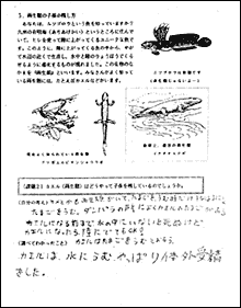 課題の予想は22人中,「カエルは受精しないと思う」が17人,「カエルも体外受精すると思う」が5人。まだ子孫を残すには受精が必要という認識には到達していない。そんなものがなくても,めすがいれば自然に子どもは生まれると思っている。ここでは「体外受精」という言葉を自分で書きこませて用語の定着をはかりたいと考えた。 |
