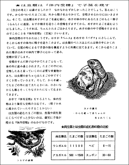 そこで説明。プリントに「ペニス」「バギナ」が初登場。爬虫類の卵の数が魚類や両生類に比べてぐんと少ないことから,体内受精の有利さを話す。
