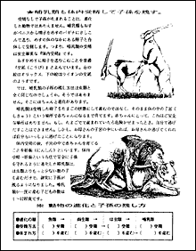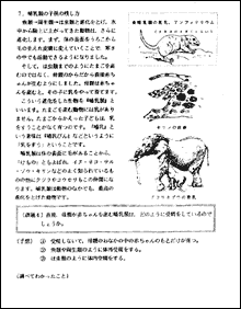 生物・動物の意味をおさえたうえで,「動物の進化」を説明する。井尻正二「ヒトの直系」(国民文庫)が参考になる。魚類を例に「受精」という言葉が初めて登場。水中での体外受精は危険をともない,種族の維持のためにはたくさんの卵が必要なことを説明。