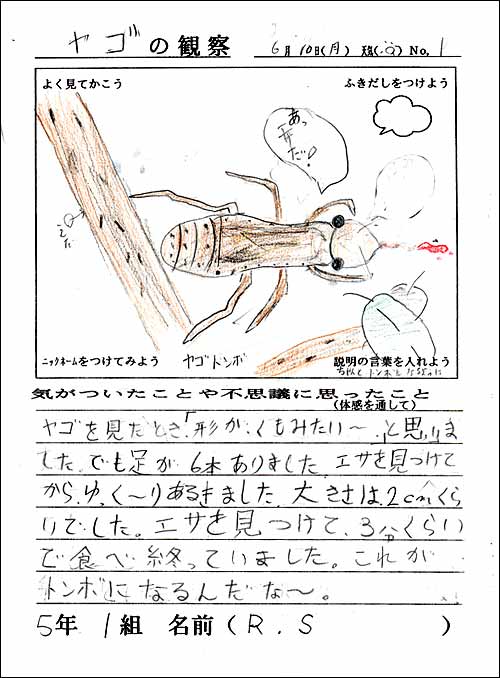 トンボを採取して,トンボの体を観察したり,産卵させたりして,思いや問いを観察カードに書く。