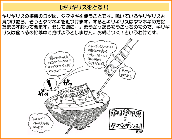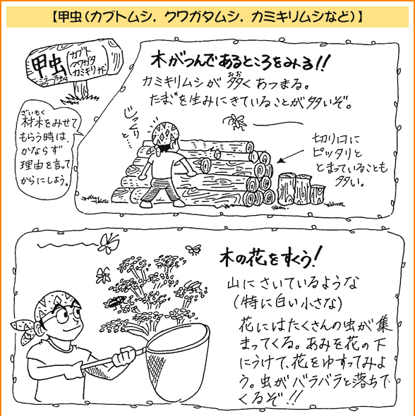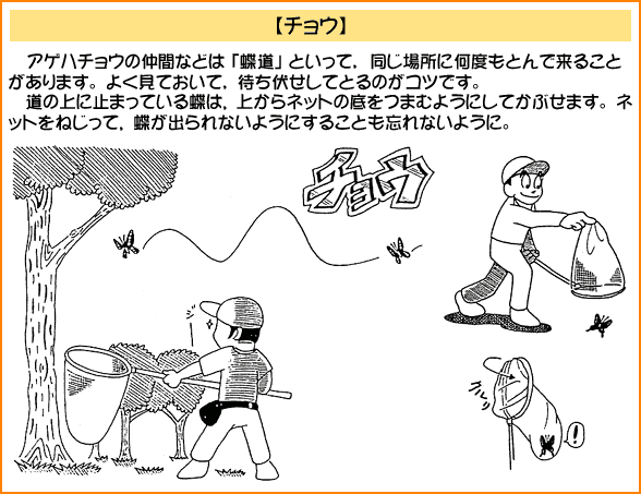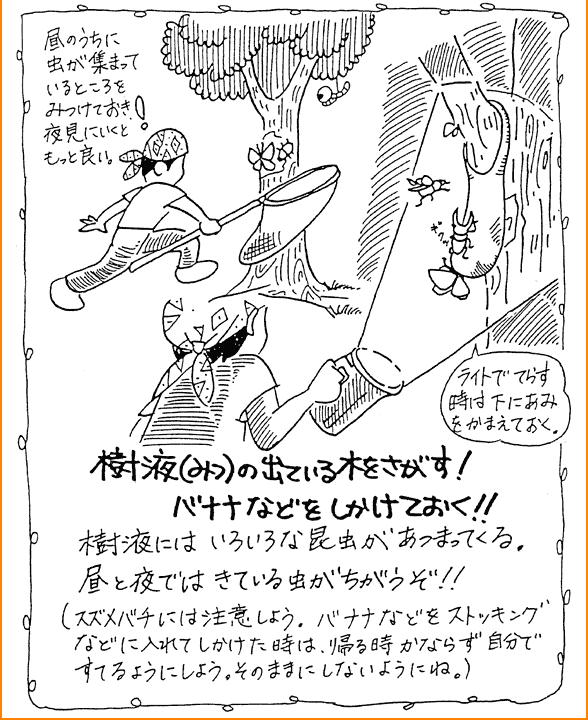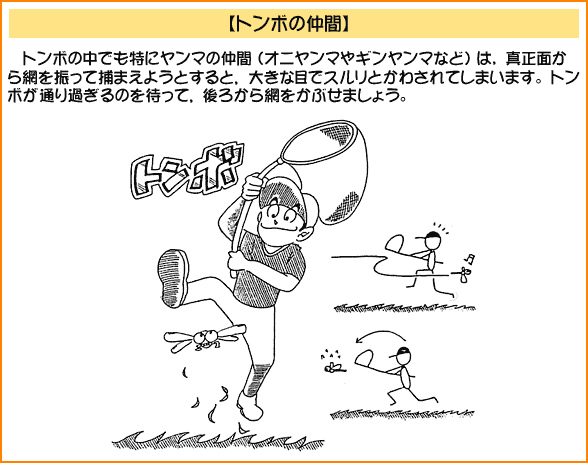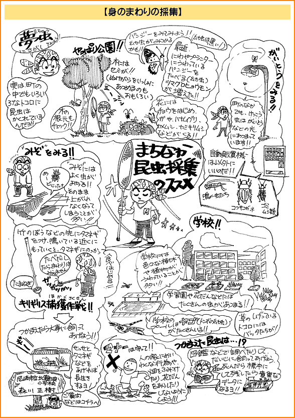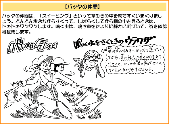 2.昆虫採集 私は昆虫採集を積極的にすすめたい。よく,「虫を採ったらかわいそうだから見るだけにしましょう」などという話を耳にする事があるが,昆虫は手にとらなければほとんど知ることは出来ない。カマキリに手をはさまれて「痛っ」と思ったときにカマキリを知るのである。手に持ったときに"虫の命が伝わってくる"のである。それを「見るだけにしましょう」などと言うのは避けた方がよいであろう。子どもたちが感性を伸ばす機会を奪ってしまうことになる。 また,つかまえた昆虫を持って帰りたい,飼ってみたいという子にはどんどん飼育させてやりたい。飼育することはその昆虫をもっと深く知ることになり,探求心,知的好奇心もわき,子どもたち自ら学んでいく。長く生かしたいと考えたり,死んでしまってもそこには様々な学びがある。 以下に昆虫採集のコツをイラストで表してみた。 ![]() ![]() ![]() ![]() ![]() ![]() ![]() ![]()