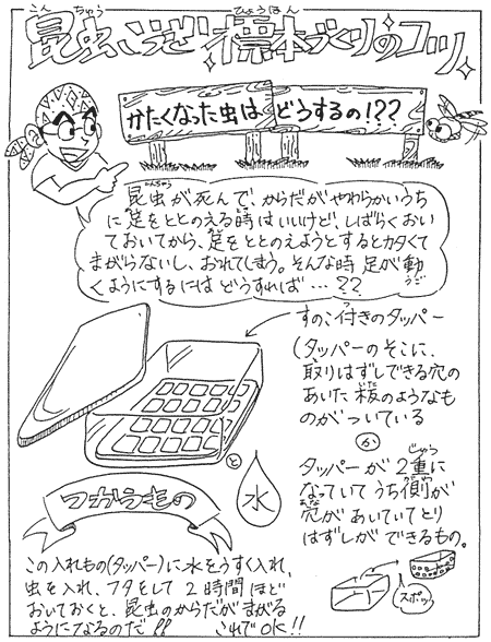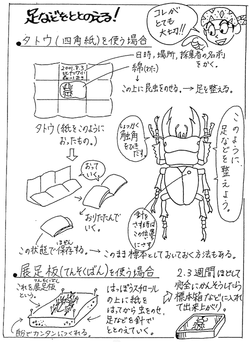 3.標本作製 採集した昆虫の標本を作製する。飼育していた昆虫が死んだら標本として残す。これは学術的にも意味のあることである。昆虫が死んでしまったら,「埋めてあげましょうね」もいいが,時には「標本として永遠に残してあげよう」という機会があってもいいと思う。 標本作りを通して昆虫の名前を調べたり,からだをよく観察し,仕組みを知る。「じっくりみる」ということになる。甲虫などはあまり難しい技術を用いずに作ることも出来るので,時間のとれる時に挑戦されることをおすすめする。 以下に,簡単に出来る標本作製の方法をイラストで紹介する。 ![]() ![]() ![]()