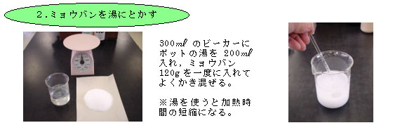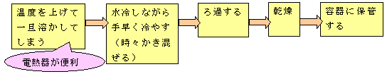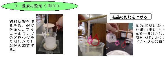 5.残った液と結晶の処理について 母液の中にはまだ多量のミョウバンが溶け込んでおり,析出した結晶もビーカーの底に固まっている。これらのミョウバンを回収して再利用できるようにしておく。 ![]() 6.続けて2回目を行うとき ミョウバン(含水塩)の溶解度・・・水100gにとけ得る量は,60℃で約57gである。かざり1個につき10g程度のミョウバンの結晶がつくので,取り出した分のミョウバンをを追加してやれば2回目ができる。その際加熱によって蒸発する水の減少があるので考慮して追加しないと,液の中にモールが完全に沈まずその部分には結晶がつかなくなる。 | |||||||||||||||||||||||||