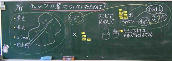 | 5年「植物の発芽と成長」 ↑クラスで一番よい班の方法を,大きな紙の中にかき,全員で検討する。 |