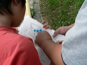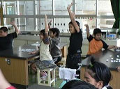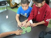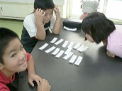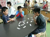 葉(実物)を提示し,植物名のカードを選ばせる。グループ単位でカルタの要領で競い合う。苦手な児童のためにわかりやすい植物名のカードは人数分用意する。 |