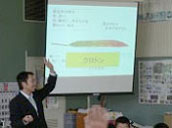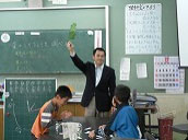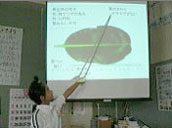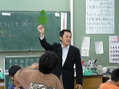 校内にある木の中から児童が自分の木を一本選ぶ。その葉をスキャナで取り込み,スクリーンに映して児童に特徴を発表させる。 |