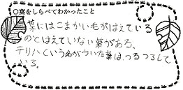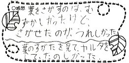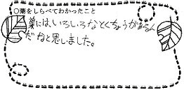 子どもたちは見慣れた葉にあらたな興味を持ち,とても意欲的に活動してくれた。何より感想で「葉っぱウォークラリーで見つけられなかったものを見つけたい。」「調べていない新しい葉をもっと調べたい。」とあった。今後もより充実させ,さらに植物に興味を持ってもらうように工夫した授業をしていきたいと考えた。