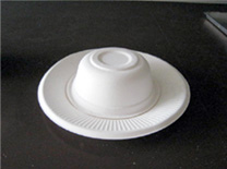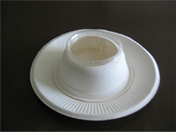 紙皿(浅い物と深い物)を用意します。深い紙皿の底をくりぬき,浅い紙皿の上に伏せて置きます。プラスチックカップがちょうど受け止められるようにします。プラスチックカップの蓋には,一辺2cm程度の正方形の穴をあけておきます。