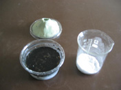 プラスチックカップ(容量120ml)に「焼石膏(30g」,「PVA洗濯のり(30g)」と「水(30cc)」を入れてよく混ぜます。 さらに,墨汁とバーミキュライトを適量加えて,溶岩や岩石の感じを出します。 |
