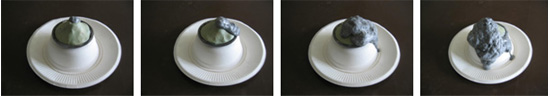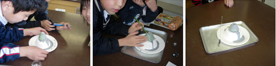 これに,重曹(10g)を加えて,割り箸でよく混ぜます。粘土をのせた蓋を置き,深い紙皿の上にセットします。 |