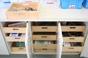 - 児童も慣れると,手分けして(1人は前から薬品を,もう1人は後ろの棚からビーカーと試験管立てを,別の1人は横の棚からガスコンロを)用意できるため,必要なものがスムーズに用意できます。