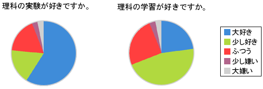 以前とったアンケート(私のクラス)で,理科の実験が好きまたは大好き:24名(77%)が,理科の学習が好きまたは大好き:21名(68%)を上まわっています。