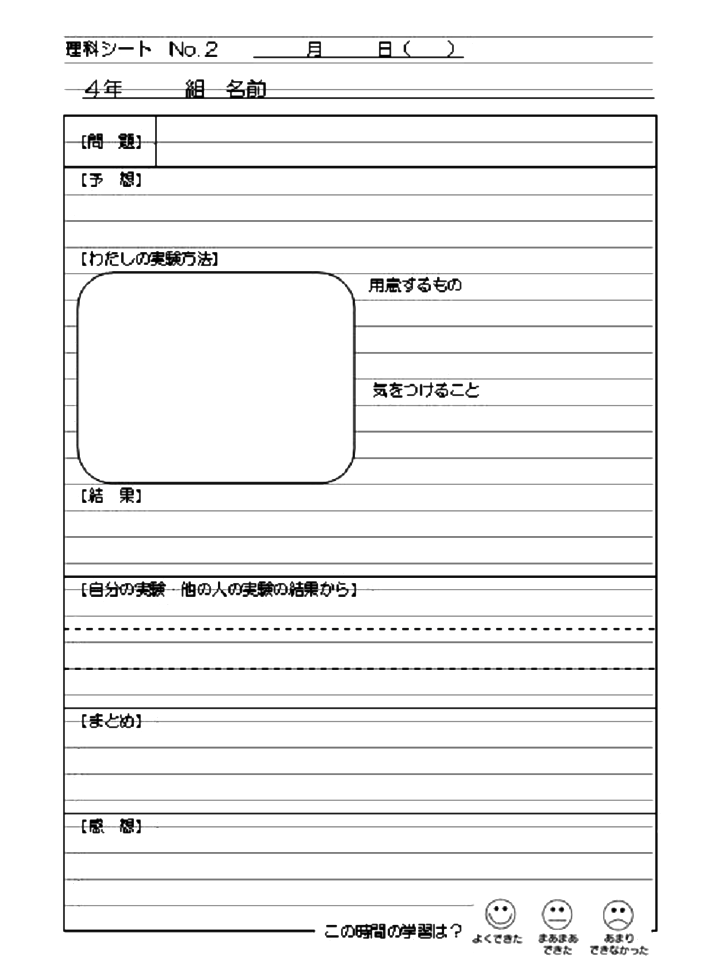 担任している子どもたちは,明るく素直で意欲的に学習に取り組もうとする子が多く,理科の学習に対してもほとんどの子が好きと感じている。しかしなかには実験は楽しいと感じていても,予想したり,実験の結果をまとめたり,結果から考察したりすることに苦手意識を持っている子も少なからずいた。そこで,この学習を通して子どもたちに問題解決学習の方法を理解させるとともに,根拠を持って予想したり,工夫して実験に取り組み,考察したりするという「考える楽しさ」を十分に味わわせたいと考えた。