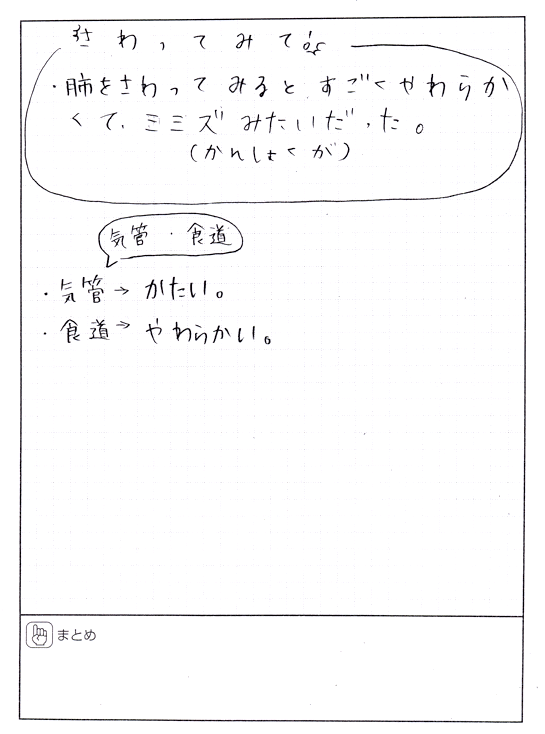 きょう,私はブタの肺をはじめて見ました。先生がはこから出した時,わたしはとても,どきっとしました。気管にさわってみたら,プラスチックみたいにかたかったです。でも食道はやわらかくてぷにゅぷにゅでした。