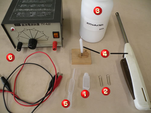 @ボトルキャップ ・直方体の小さなもの。 ・お弁当でポン酢を入れたりするもの Aゼムクリップ×2 ・色でコーティングされていないもの Bカリウムミョウバン ・漬物用の焼ミョウバンでもOKです。 Cろうそく・チャッカマン ・立てて使います。 Dスポイト ・小さなものが使いやすいです E電源装置 ・9〜12Vで使います。 ・乾電池でもできますが,この方がお手軽で確実です。 3.実験の準備 (1)ミョウバンの飽和水溶液を作る。