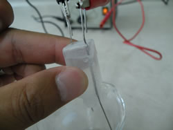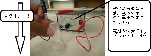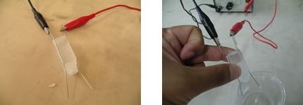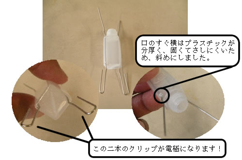 ※ボトルキャップの口を下に向けて、電極に電源装置の両極をつなぎます。