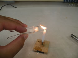 ※ボトルキャップの中の水が電気分解されて、水素と酸素が発生します。よく見ると、それぞれの電極から気体が発生しているのがわかります。更によく観察すると、電極によって気体の発生量が違うのも見て取れます。 (4)爆鳴気を鳴らしてみよう!