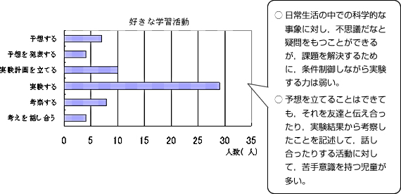(1)児童の興味・関心に基づく課題の設定 (2)考えを表現し合う場の設定 (3)ワークシートの工夫 (4)学習活動の言語化 |