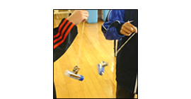 | 身の回りの物を使って,手作りふりこを作って遊びました。ただ作るだけではおもしろくないので,メトロノームに合わせて「1秒ふりこ」を作りました。子どもは,ぶら下げるものを変えたり,糸の長さを変えたり,ふれはばを大きくしてみたり,試行錯誤を繰り返していました。 | 上の実験では,ふれはば・糸の長さ・おもりの重さ全て同じ条件にしました。同じ重さでも,おもりを縦に並べたものと横に並べたものを用意しました。子どもの予想は,