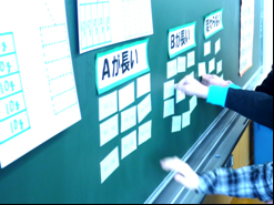 | 「なんとなく」予想を立てるのではなく,「どのような理由で」予想を立てたのか,根拠を持たせるようにしてワークシートに記入させました。さらに,自分の予想と同じところに,名札を貼らせるようにしました。これをもとに,意見を交流します。ここでは,異なる予想の友達に納得させるような理由づけが言えるかどうかが大切です。また,交流した後,友達の考えを参考にして予想の変更も可能としました。このようにして,根拠のある予想を立てられるようにしました。 | ![]() |