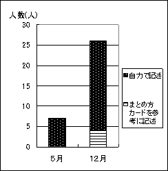 学習の振り返りでは,「予想・方法・結果・考察」を言語化し,自分の学習活動を整理させました。自力で記述できない児童には,「まとめ方カード」を参考にさせて指導し,どの児童も表現できるようにしました。 |