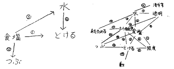 「とける」という言葉を中心にして書かせるのだが,図―1のように学習前はなかなか書けない。「とける」といってもその子によって生活経験や素朴概念が違っている。そこで,一人で書いたあとに,グループで話し合いながらイメージマップをまとめさせるとそれぞれの素朴概念が出てきておもしろい。図―2は,同じ児童の学習後のイメージマップである。学習したことがいかされ,言葉の結びつきがはっきりしており,その理由も明確であった。