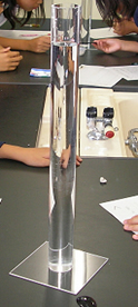 そこで,溶質が水に溶けていく様子をじっくりと観察させるために右の写真のように透明なアクリルパイプを使って変化の様子を見せることにした。長さ50cm,内径3.5cmで,水を400ml入れると水位は45cmになり,食塩を10g入れると水位が約0.5p上がる。