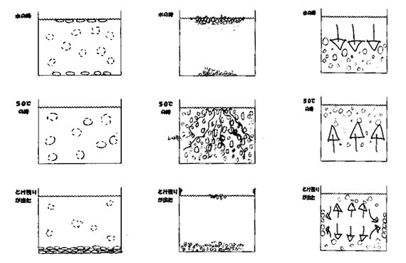 下記の図は,ホウ酸の温度によるとけ方の違いをイメージ図で表したものである。