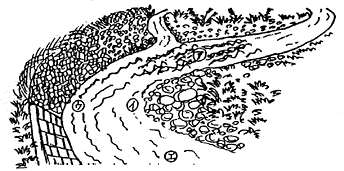 | 校庭に降った雨水は,溝をつくって流れ,排水溝に入るものがある。 |