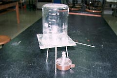 ![]() 4.まとめ 子どもたちには実験方法をグループ毎に考えさせていたので,まずそれを発表してもらった。危なくなく温まり方の様子がわかりそうな方法が1つあったので,話し合いの結果少し改良して,その実験を先にやってみた。 装置Bは写真のように簡単なものである。暗幕のないところで実験してみたが,ビーカーの中で煙がまさしく対流しているのが良く見られた。子どもたちも一様に驚き・感動の声をあげた。アルコールランプなしでも良い結果が得られた。