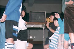 ![]() そのあと暗幕をひいて教師の手作り教材Aで実験した。いろいろと試しているので,温まり方はよくわかるのであるが,その前に行った1つのグループが考えた方法がすばらしかったので,感動は薄かったようである。思いがけず2つの方法が紹介できた。装置Bは自信を持ってお勧めする。