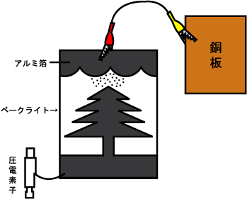 @アルミ箔を雲部分と地上にある建物や木をデザインしたものを切り取る。 A@のアルミ箔を両面テープでベークライト板に付着する。 B雲部分と建物との間にのりをつけ鉄粉を満遍なくふりかける。 釘をヤスリでこすることで細かい鉄粉ができる。 Cワニクリップを雲部分にもう片方のクリップは銅板(アルミ板)につなげ地上部分に圧電素子を接触させながらパチンと押すとカミナリが起きたように光の道が見えてくる。