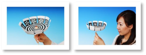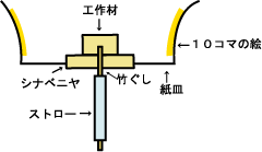 まず,アニメ盤づくりから始める。 アニメ盤は,10コマの絵で構成しそれぞれの絵は少しずつ変化させて描く。 @ペーパープレートに見本または作製したイラストを貼りつける。その際,真中の位置を決め,のりを直径2pの円を描くように塗る。 次に,外側にある絵の裏にのりをつけ,ペーパープレートに貼っていく。 Aのりが乾いたら絵と絵の間にある白色部分をプレートといっしょに切り取る。プレートの裏を見ると皿の底部分の円まで切れているかどうかを確かめ底部分に沿ってカッターナイフで横を切りとる。 B円の中心に千枚通しで穴を開け固定するためのベニヤを下図のように挟み,竹ひごを指し込み,接着剤で固定する。(接着剤が乾くまで待つ) ●使い方 竹ひごにストローを指し込み,片手でストローを持ちもう片手の手で竹ひごの下部を回す。目はスリットの位置に置き覗くと絵が動くように見える。 10コマの絵を創作させ独自の作品を相互に交換して鑑賞し合うのもいい。 |