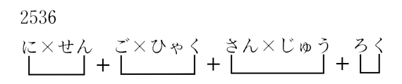 日本語の命数法は,「いち,に,さん,……,く」という数詞と「じゅう,ひゃく,せん,……」というまとめた大きさを表す数詞との間で,次のように乗法と加法を交互に組み合わせる方法になっています。