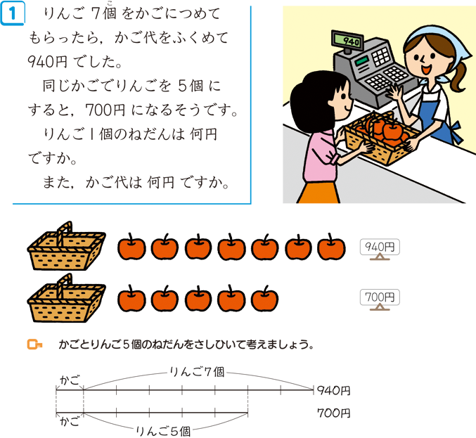 相殺の考えとは,問題で示されている要素や条件のうち同等な要素に着目してそれを差し引き,より単純な新しい関係を引き出す思考法です。例えば,下記の問題で,かごとりんご5個がどちらにも共通に含まれていることに着目して相殺すると,りんご2個が240円に相当するというより単純な新しい関係を引き出すことができます。