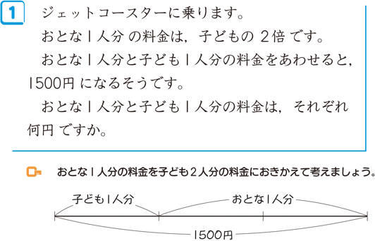 一方,置換の考えとは,問題で示されているある要素をほかの要素に置き換えて新しい関係を引き出す思考法です。例えば,下記の問題は,大人1人分を子ども2人分に置き換えて考えることによって,全体の量が子ども3人分に相当するという新しい関係を見出すことができます。