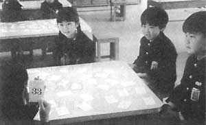 このように,半具体物を使った数遊びから数字カードを使った数遊びへ誘うことにより,量の大きさや違いとしてとらえていた見方を数の大きさや違いとしてとらえようとしていくのである。また,集合数のみにとらえがちであった数字を順序数としてもとらえていくことができるようになる。ここに,数遊びを通した数の世界のひろがりをみることができよう。