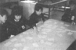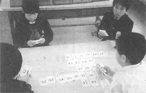 まず,50枚のカードを裏返しにして並べ,代表の子が1枚ほどカードを抜いて,そのカードの数字を他の3人が当て合う数遊びである。