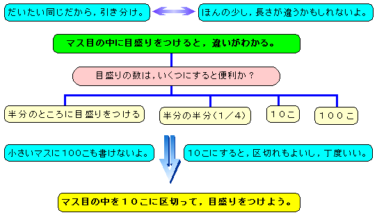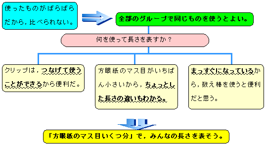 1.はじめに 〜「長さ」の学習を構成するにあたって〜 2年生の「長さ」の学習は,子どもたちが生活の中で出会う様々な量に対する見方・考え方の基盤を育てるために重要である。ここでは,1学年の学習で経験した長さの直接比較や間接比較,任意単位による測定などをふまえて,子どもたちに次のような力を身につけさせたいと考えた。 ![]() そこで,これらのねらいを達成させるための学習構成と支援のポイントを次のように設定して指導を行うことにした。